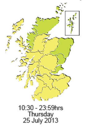 A similar story occurred on 28th July. Again the FGS and Flood Alerts were highlighting the risk of heavy isolated showers and residents in Camelon near Falkirk experienced flooding in their gardens (BBC News). Throughout the week there was local disruption to transport across Scotland with surface water slowing traffic and roads closed at known flooding hot spots. Luckily the heaviest showers forecast have not come to fruition, but the spell of showery weather isn’t over yet so we could see more impacts before the end of the summer. Don’t forget that many of the biggest impacts from flooding occur during the summer months. For example Glasgow experienced floods in July 2002, June 2007, August 2011 and July 2012, so it shouldn’t come as too much of a shock when we see flash flooding in the summer.