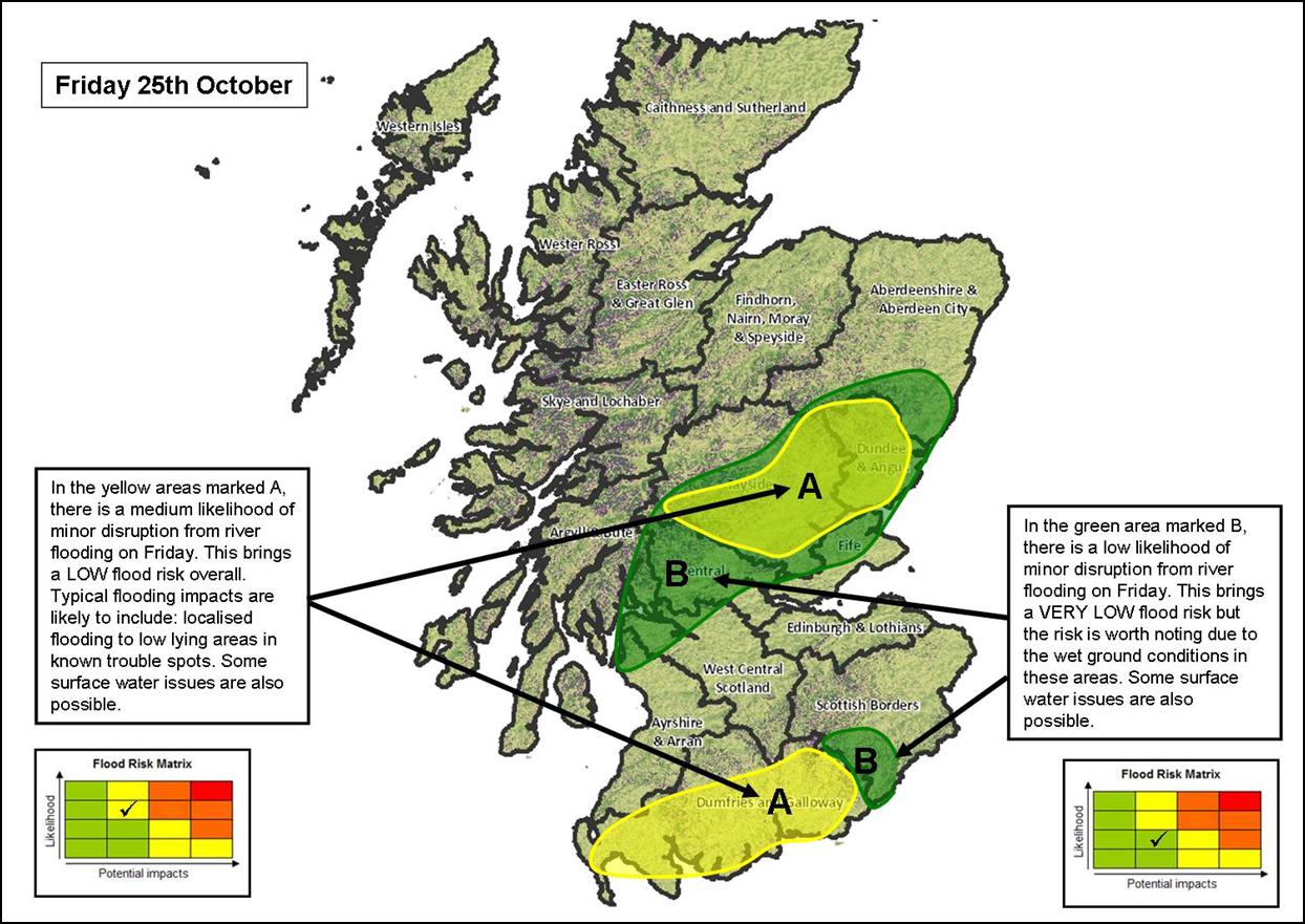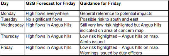 During the week leading up to Friday 25th October a succession of forecasts indicated that some flood related activity could be a possibility on the Friday. On the Monday there was a strong signal for high flows in most parts of southern Scotland for Friday. At this stage we relied on the forecasting service meteorologist’s view as to the likelihood of this event, and kept it in mind. As the week went on, the forecasts pointed more to a potential event in the Angus hills to the east of Scotland, and with forecaster professional judgement and Met Office guidance giving confidence in that outcome, the Flood Guidance Statement became more focussed on that area.