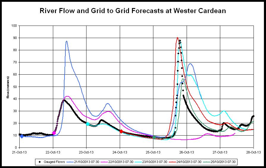 Figure 1 shows the flows for a site in the risk area, forecast on subsequent days in the run up to October 25th. The actual gauged flows are also plotted.