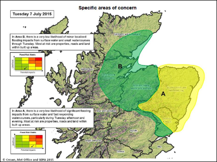 The exact location, intensity and timing of heavy showers are notoriously difficult to forecast. Scottish Flood Forecasting Service (SFFS) meteorologists and hydrologists did however decide there was enough evidence to warn of the risk of significant ‘surface water’ impacts on the preceding Monday. This risk was repeated in the SFFS Flood Guidance Statement and accompanied by alerts on the day of the flooding.