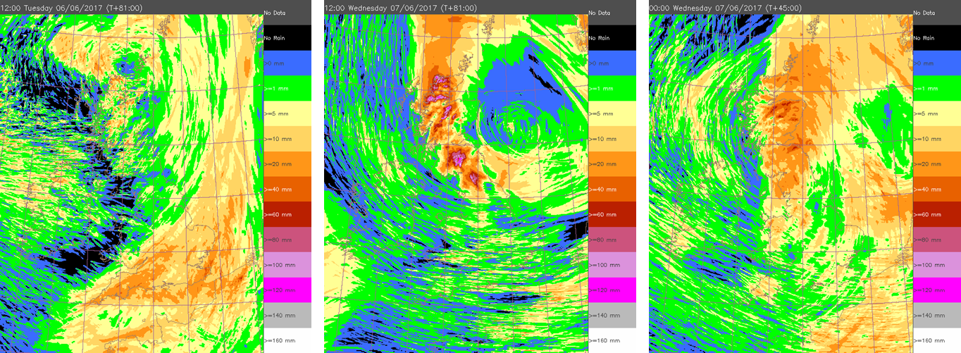 It had been a fairly quiet few months for the operational side of the Scottish Flood Forecasting Service, before heavy rain struck much of the country at the start of June, causing some significant flooding in the north east, and minor flooding in many other locations. Forecasts consistently indicated low pressure and ‘wrap around’ feature bringing heavy rain to the north and north east in particular, though there was some variation from forecast to forecast as to the exact location and rainfall amount forecast, as shown in Figure 1.