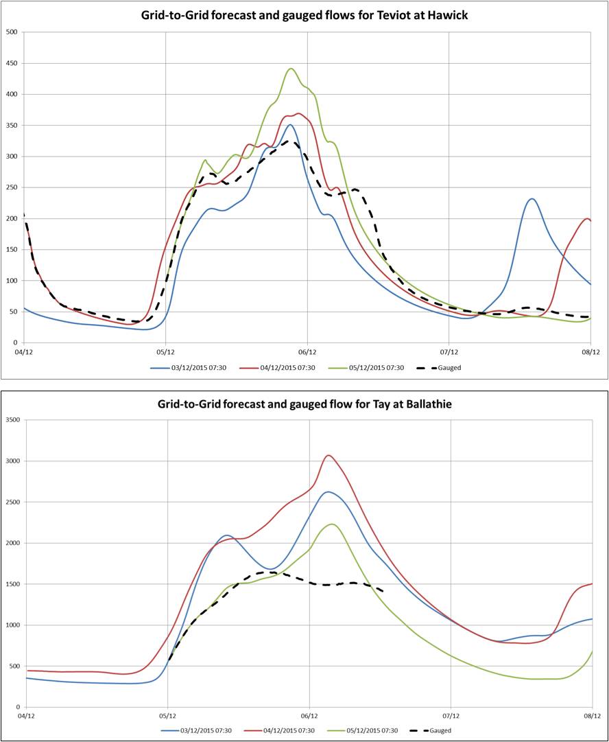 Forecast 1 generally overpredicted the amount of rainfall across Scotland, but whereas forecast 2 underpredicted the rainfall for the Dee catchments, it overpredicted for the more southern gauges (and the River Dee at Park). The rainfall totals were however, still less than for forecast 1. The estimates of peak flows were generally improved over the southern catchments compared to those in the NE. Figure 6 shows the variations in predicted precipitation and river flow for the different forecasts for the River Cree at Newton Stewart in Dumfries and Galloway.