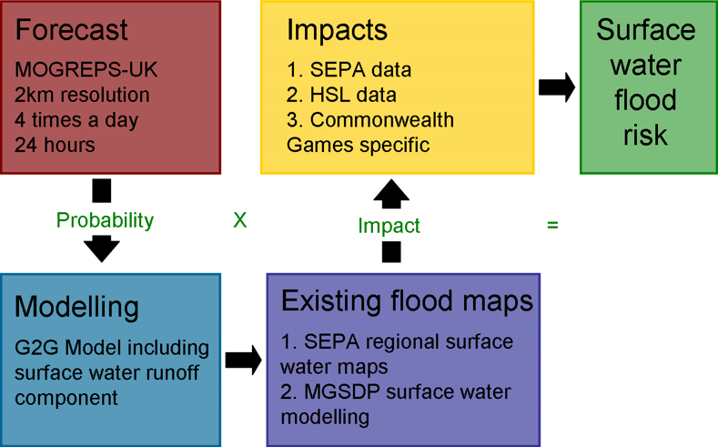 Based on the outputs from the project reports and the steering group we hope to combine the state of the art probabilistic forecasting from the Met Office MOGREPS-UK ensemble with the proven real time surface water runoff modelling capabilities of the Grid-to-Grid model. This will then be linked to existing flood hazard maps and impact assessments to inform a daily surface water risk assessment for Glasgow. A summary of the methodology is shown below. Combining all of these elements in a real time forecasting system is new. No one else is currently doing this therefore we have an exciting but challenging few months ahead to prepare the pilot model for use during the 2014 Commonwealth Games in Glasgow.